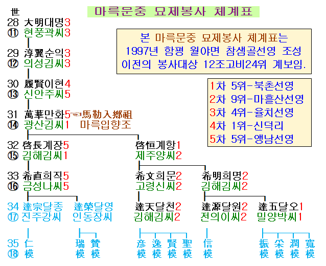 마륵문중의 선영은 과거 북촌과 마흘산, 운천동 그리고 화순의 도곡, 앵남 등지에 산재해 있던 관계로 하루에 봉사하기가 어려워 이틀 동안에 대여섯 군데를 옮겨가며 제향을 올리는 번거로움이 있었으니, 1997년의 참샘골 선영 합동 이장 이전에는 매년 음력 10월 보름날이 되면 마륵리에서 제수를 장만하여 1차로 오전에 북촌선영에서 마륵문중의 소몽조이신 31世 휘 만화의 배부인 광산김씨를 주벽으로 하여 큰 자부(32世 휘 계장의 배위) 김해김씨와 차자 휘 계항, 그리고 증손 내외인 34世 휘 달오와 배위 밀양박씨 까지 총 5위를 향사하고, 2차로 오후에는 송정리 소재 마흘산 선영에 가서 주벽인 32世 휘 계항의 배위 제주양씨 이하 그 장자 33世 휘 희문과 배위 고령신씨, 차자 휘 희명과 배위 김해김씨, 그리고 큰손자 34世 휘 달천과 배위 김해김씨, 작은집 손자 휘 달원과 배위 전의이씨 이렇게 총 9위를 향사하였다.